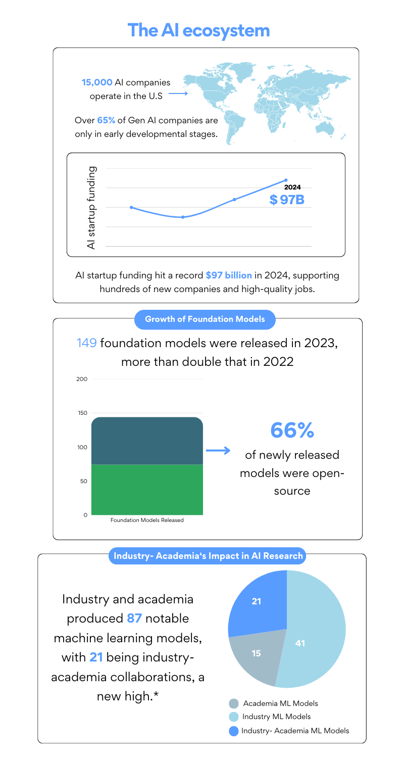* in 2023. Sources: AI Startup Funding Hit a Record $97 Billion in 2024, Artificial Intelligence Index Report 2024, Statista, Unlocking the Economic Potential of U.S. Generative AI.